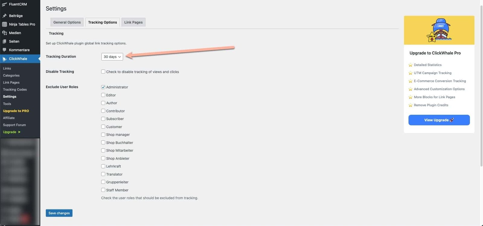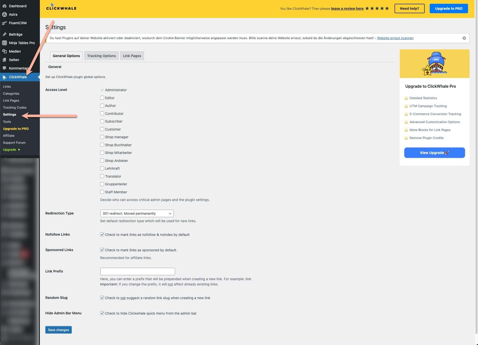 Du kannst detailliert festlegen, wer alles Zugriff auf ClickWhale* hat. In meinem Fall nur die Admins. Das reicht. Aber in manchen Fällen macht es Sinn, auch Autoren Zugriff zu gewähren.