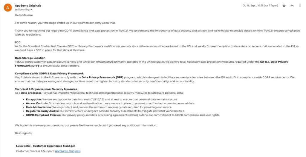 Ich habe explizit beim TidyCal-Support nach den Themen Datenschutz, DSGVO und internationale Datentransfers gefragt.