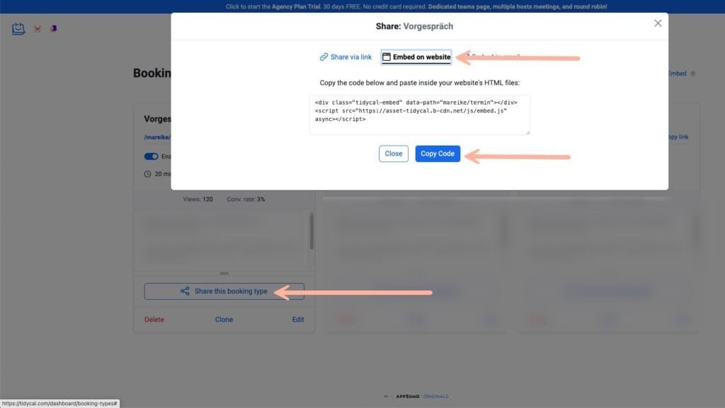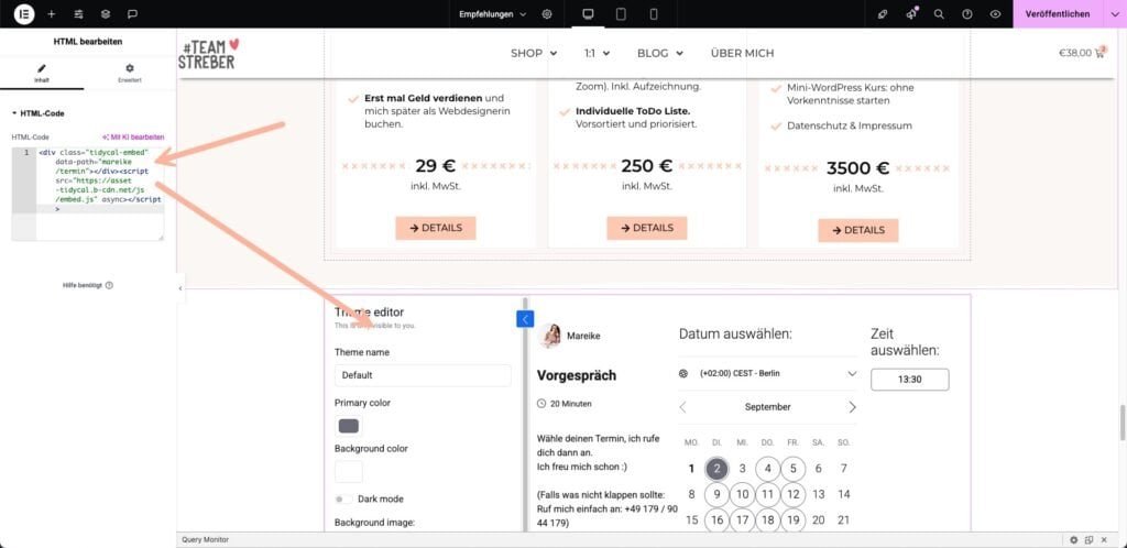 Binde TidyCal ganz normal in deine Seite ein, wo du die Terminbuchung haben möchtest: Dazu nutzt du den Embedd Code, den du in TidyCal generieren kannst.