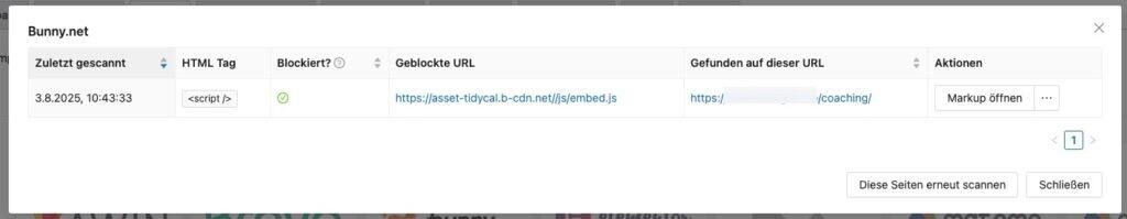 Der Scanner wird automatisch Bunny.net als Service finden – das ist das CDN, über das TidyCal seine Skripte lädt.